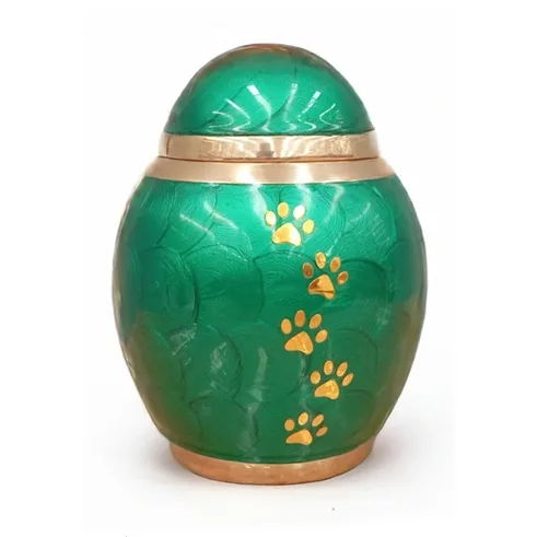 Es uno de nuestros modelos favoritos, fabricada en bronce, tiene un reluciente color verde esmeralda y acabado amarfilado. Esta ánfora tiene 5 patitas doradas talladas a mano: 4 alrededor de su cuerpo y una en la parte superior.